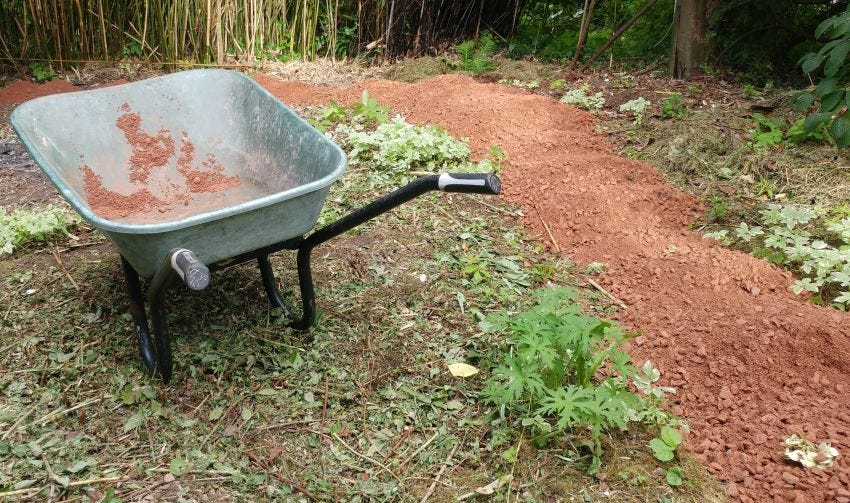 The big trick with the gravel though is getting what is termed locally 25 to dust - the 25 being millimetres. It’s gravel that hasn’t been washed and has clay in with it. (Related to what is poshly called hoggin) You shovel it down, about 2 inches thick, rake it level and if you’re feeling ambitious, squash it or tamp it down. It will look unpromising. But when it rains the dusty bit, which is the clay, washes through and disappears from sight and after a few weeks it sets solid.